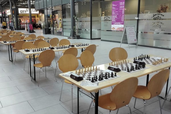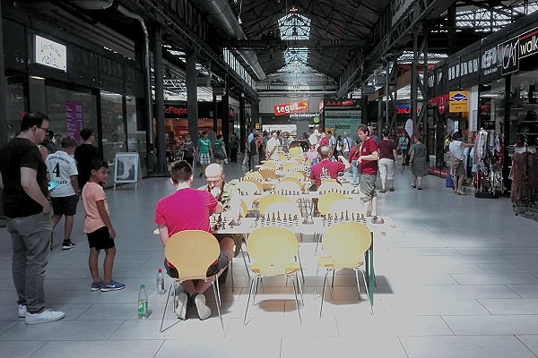 Die Auslosung der ersten Runde brachte an Brett 1. die Paarung Friedel Dicks – GM Alexander Donchenko. Mir gelang ein Kurzsieg gegen einen jugendlichen Anfänger, so dass mir noch Zeit blieb bis zur nächsten Runde. Da konnte ich die Vorteile eines Einkaufszentrums als Spielort ausnutzen und mir eine Hose kaufen. Mit Anprobe reichte die Zeit, um zur nächsten Runde pünktlich am Brett zu sein. Bevor ich mich wieder dem Turnier widme möchte ich noch kurz auf die Location eingehen. Das Einkaufszentrum wurde vor 10 Jahren in einem ehemaligen Eisenbahn Betriebswerk, dessen Anfänge bis ins Jahr 1862 zurückreichen, eingerichtet. Architektonisch kein Vergleich zum Limbecker Platz. Teilweise sieht man das gut auf den beiliegenden Bildern, die alle von Friedel Dicks zur Verfügung gestellt wurden.