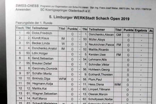 99 Spieler nahmen mit einer leichten zeitlichen Verzögerung den Kampf um Punkte und Preise auf. Die Nummer eins der Setzliste und klarer Turnierfavorit war der in Gießen wohnende Großmeister Alexander Donchenko mit ELO 2618! Es folgten die Internationalen Meister Klaus Klundt und Anatoli Donchenko, der Vater von Alexander. Weiterhin 3 FIDE Meister, darunter Uwe Kersten und mit Olga Birkholz, der neu gewählten Vizepräsidentin des Deutschen Schachbundes, eine weibliche FIDE-Meisterin.