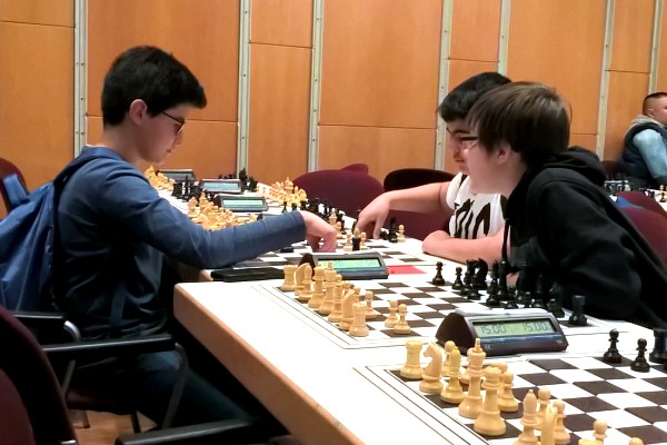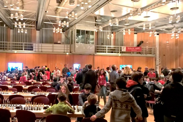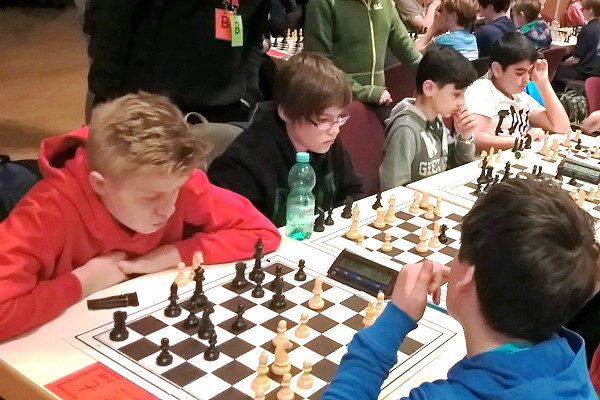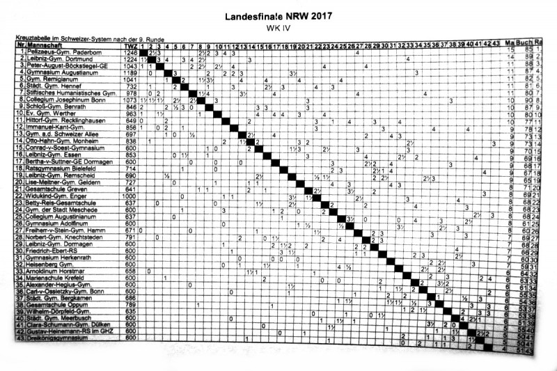 Mit einem lockeren 4:0-Sieg gegen das Clara-Schumann-Gymnasium Dülken startete die Mannschaft in das Turnier. In der zweiten Runde konnten Luca und Justin schnelle Siege verbuchen. Leider büßte Yusuf entscheidendes Material ein und auch Keanu stellte mit einer Figur mehr einen ganzen Turm weg, also Unentschieden gegen die Marienschule Krefeld. Gegen das Schloß-Gymnasium Benrath gab es dann die erste Niederlage (1:3): Keanu wusste dem Mattangriff des Gegners nichts entgegenzusetzen, Adem stellte die Dame ein und Justin konnte sein Turmendspiel mit Mehrläufer nach einer Gabel nicht mehr halten. Den Ehrentreffer machte Luca, der in ausgeglichener Stellung plötzlich Matt setzen konnte. Gegen das Heisenberg Gymnasium übersah Yusuf eine Gabel auf König und Dame. An den anderen Brettern hatten Luca, Keanu und Adem jeweils Gewinnstellungen, wobei nur Adem seine nicht voll verwerten konnte, sodass es einen weiteren Sieg gab (2,5:1,5). In Runde 5 knöpften Justin, Keanu und Adem ihren Gegnern die Dame ab, und auch Luca gewann: 4:0 gegen das Norbert-Gymnasium Knechtsteden. In der nächsten Runde verwechselte Justin eine Eröffnungsvariante, was ihn eine Figur kostete, und auch Keanu verlor wertvolles Material nach einer Gabel. Auch, wenn Yusuf seine Verluststellung noch um 180° drehen konnte, so hatte Luca mit Minusbauer keine Gewinnaussichten und willigte ins Remis ein: 1,5:2,5-Niederlage gegen das städt. Gymnasium Hennef. Gegen die Gesamtschule Greven konnten Luca, Justin und Keanu leicht gewinnen, während Adem leider verlor, 3:1-Sieg.