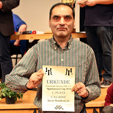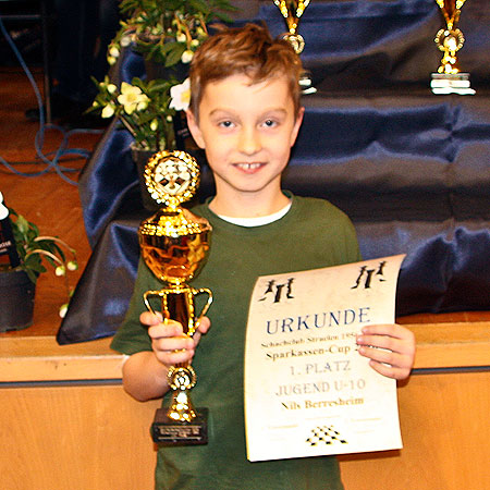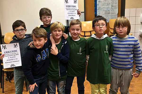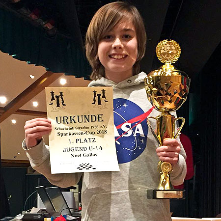 Zum dritten Mal in Folge konnten wir beim Internationalen Schnellschachturnier in Straelen den Pokal als bester Verein mit nach Essen nehmen. Gut für uns: Der Wanderpokal bleibt nun auf Dauer unser. Schlecht für die Veranstalter: Fürs nächste Jahr muss ein neuer Pokal in Auftrag gegeben werden. Aber der Platz für neue Plaketten wurde ohnehin langsam knapp...