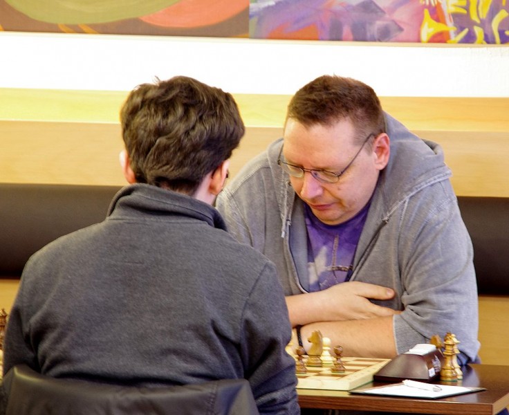 Josua, der erst vor gut einem Jahr als Quereinsteiger vom Internet-Schach zu uns gekommen ist und seine erste richtige Liga-Saison "am Brett" spielt, hatte seinem erfahrenen Gegner in einem taktischen Scharmützel nicht nur einen Bauern abgenommen, sondern ihm in der Folge auch noch die Bauernstruktur gründlich ruiniert – zwei isolierte Doppelbauern auf d3/d4 und b3/b4 sieht man nicht alle Tage! Das resultierende Doppelturmendspiel konnte er dann sicher nach Hause bringen: Big Point, Mannschaftssieg, Zwischenstand 5:2 und der erneute Aufstieg zum Greifen nah!