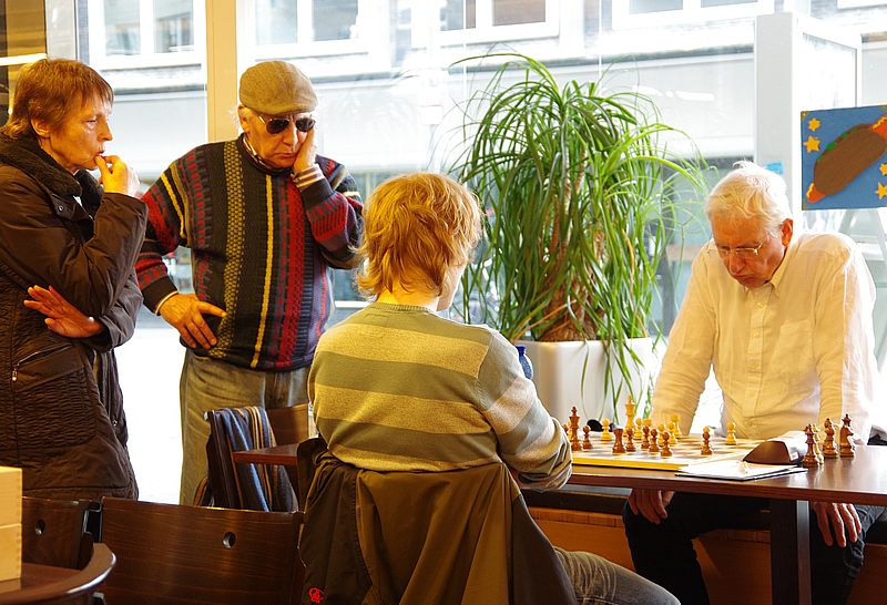In der Verbandsklasse musste Tabellenführer SFK4 im Auswärtskampf beim direkten Konkurrenten SW Oberhausen antreten. Als Ihr Berichterstatter nach zwei Stunden Spielzeit und einem Spielstand von 0,5:0,5 – Tim Dette hatte Remis gespielt - im Cafe Lunchström in der Oberhauser Fußgängerzone eintraf, fiel durch Nikita Gorainow eine erste Vorentscheidung.