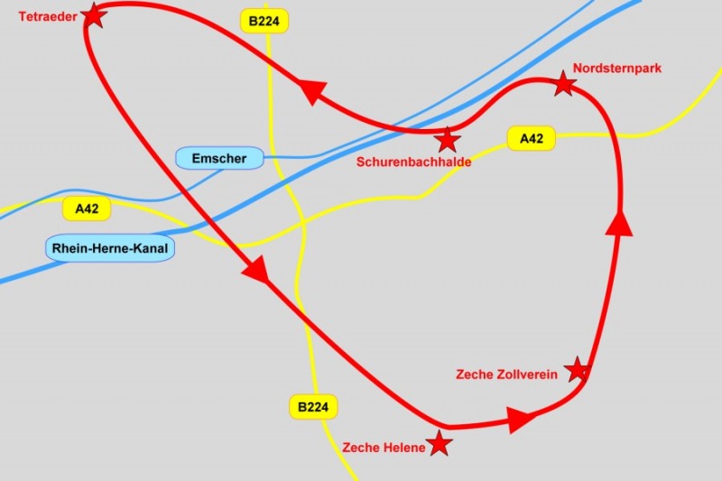 Kurs: Zeche Helene -> Nordsternpark -> Halde Schurenbach (die mit der Bramme) -> Tetraeder Bottrop -> Zeche Helene