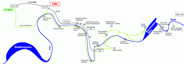 Wir folgen der ehemaligen Eisenbahntrasse und stoßen bei der "Zornigen Ameise" auf die Kaiser-Route Aachen - Paderborn (auf diesem Weg zog 775 Kaiser Karl der Große mit seinen Heerscharen in kriegerischer Absicht gen Sachsen). In Steele wechseln wir auf die südliche Ruhrseite bis Hattingen. Von dort wieder am nördlichen Ruhrufer entlang bis zum Kemnader See. Unser Wendepunkt ist an der ehemailgen Zeche Gibraltar. |
