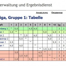 Es liefen noch die drei Partien von Holger Stratmann (Brett 1), Ralf Stremmel (Brett 4) und Bernd Sauer (Brett 6), aus denen wir den noch fehlenden halben Punkt machen mussten. Ralf stand mit T+L+2B gegen die weiße Dame in einer stabilen Festung und hatte sogar schon ein gegnerisches Remisangebot ausgeschlagen. Anbetracht des Spielstandes verzichtete er auf Gewinnversuche und steuerte den halben Punkt zum Mannschaftssieg bei. Holger musste leider eine Niederlage akzeptieren, während Bernd eine zwischenzeitlich schon verloren geglaubte Partie dank seiner Kampfkraft doch noch retten und am Ende zum sicheren Remis führen konnte. Endstand 5:3 und Tabellenführung für Katernberg, vgl. Bild! Nur Castrop-Rauxel 2 kann durch einen Sieg gegen Botttrop noch mit uns gleichziehen.