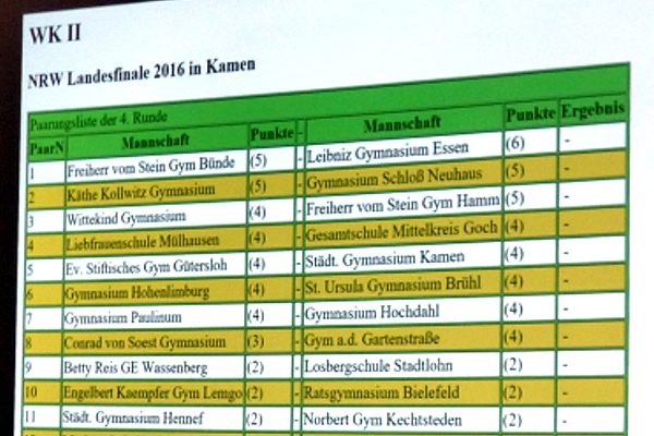 Die Niederlage der 4. Runde gegen das Freiherr vom Stein Gymnasium aus Bünde erwies sich im Nachhinein schon als turnierentscheidend: Beide Schulen gewannen ihre nachfolgenden vier Spiele, so dass Bünde mit einem Punkt Vorsprung in die letzte Runde ging. Hier kassierte unsere Auswahl die zweite Niederlage, die jedoch bedeutungslos war: Das erneut siegreiche Bünde wäre ohnehin nicht einzuholen gewesen, und Platz 2 war schon vorher gesichert. Einerseits also ein toller Erfolg, andererseits wäre mit etwas mehr Schlachtenglück in der vierten Runde auch der 1. Platz und damit die Teilnahme an der Deutschen Meisterschaft möglich gewesen.