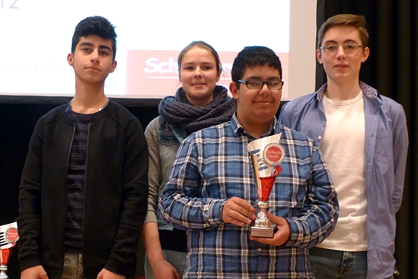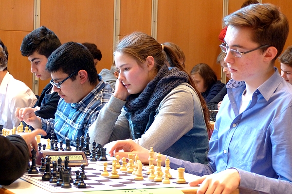 Ganz ging die Grippewelle auch am Leibniz-Gymnasium nicht vorbei: Sören Tonnemacher, der schon zu der Mannschaft gehörte, die 2010 den 3. Platz in der WK4 erkämpft hatte, meldete sich am Morgen des Turniers krank – spätestens jetzt zahlte es sich aus, dass ich zu solchen Turnieren immer mit einem Ersatzspieler plane. Einsatzbereit waren aber die routinierten Vereinsspieler Lukas Schimnatkowski, Anna Bérénice Döpper und Cem Celik, und an Brett 4 kam wie bei der Stadtmeisterschaft Lemer Hakimi zum Einsatz. Dieses Quartett startete souverän mit drei Siegen und führte schon nach drei Runden mit einem Punkt Vorsprung die Tabelle an: