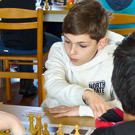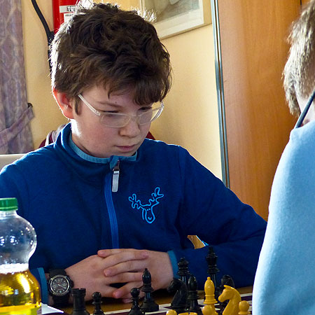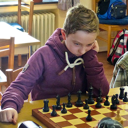 Einen krassen Fehlstart legte Samuel hin: Nach zwei Niederlagen, bei denen er einen sehr nervösen Eindruck machte, holte er zwar noch gute 5 Punkte aus den verbliebenen 7 Runden, aber das war natürlich zu wenig, um noch in Reichweite der Qualifikationsplätze zu gelangen. Konstantin blieb mit 3,5 Punkten sicher uter seinen Möglichkieten, dafür zeigte Jonathan, dass er in den letzten Monaten einen großen Schritt nach vorne gemacht hat und sich vor allem selbst etwas zutraut. Der strarke Spieler weiß ja nur zu gut, wie fehelerbehaftet sein eigenes Spiel im Grunde genommen ist - Jonathan scheint begriffen zu haben, dass die Anderen auch nicht besser sind. Vier Punkte waren in diesem Feld ein gutes Ergebnis - seinen Sieg in der dritten Runde habe ich noch miterlebt, da nahm er dem Gegner nacheinander mit Gabel, Spieß und Abzug dessen gesamte Figuren ab.