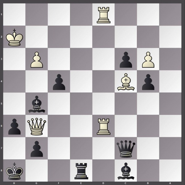 Mit dem Zug 21...La6 gelingt es, eine Blockadestellung zu errichten, auch weil die weißen Figuren nach dem Materialgewinn unkoordiniert sind (was häufig der Fall nach Materialgewinn ist). Auch wenn die Stellung objektiv vermutlich noch immer schlecht für Schwarz ist, ist es für Weiß nicht leicht, einen gewinnbringenden Plan zu finden. An diesem Problem scheiterte letzlich auch mein Gegner. Meine Vermutung war, dass Lb1-Sc2-Sb4 sinnvoll sein würde, wenngleich ich auch dann nicht sofort verloren gewesen wäre. In der Partie konnte ich meine Figuren allerdings nach und nach umgruppieren und etwas glücklich den Bauern auf a5 gewinnen und daraufhin sogar auf c3 noch einen weiteren. Danach war die Stellung natürlich gewonnen und Weiß schaffte es nicht mehr irgendeine Art von Gegenspiel aufzubauen.