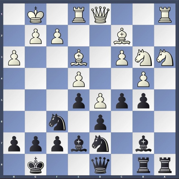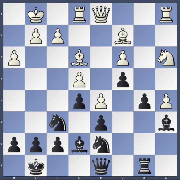 Die erste (Online-)Mannschaft traf also in der ersten Runde auf Herzogenaurach, einen nominell etwa gleich starken Konkurenten. Umso überraschender, dass diese schon in der ersten Runde mit erheblichen Ersatz an den Brettern 3 und 4 antraten, was aber natürlich mal wieder nichts heißen sollte. Allerdings gab es schon hier bereits eine Premiere zu verzeichnen, denn Tamás Kiss spielte an Brett 4 seinen ersten Mannschaftskampf für SFK. Also richtete sich der Blick natürlich schnell auf Brett 4, wo der gegnerische Spieler nach 1.d4 d6 2.c4 bereits im zweiten Zug mit 2...e5?! eine für meine Begriffe seltsame Entscheidung traf. Also wurden hier entsprechend schnell die Damen getauscht und nachdem sich Tamás nach zwischenzeitlichen Problemen entsprechend konsolidiert hatte, entstand folgende Stellung: