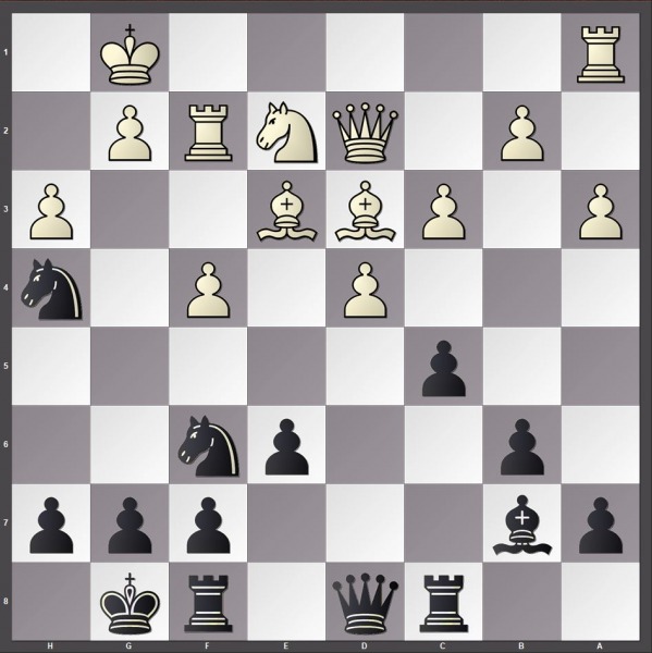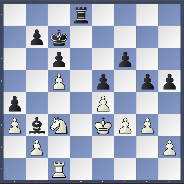 Der Gegner hatte gerade 18.Tf2? gespielt; wohl um den Bauern auf g2 zu verteidigen. Leider spielte Berthold den natürlich aussehenden Zug 18...Dd5?, wonach der Großteil des schwarzen Vorteils verfliegt. Stattdessen hätte 18...Lxg2 sofort die Fronten geklärt, da 19.Txf2?? natürlich an 19...Sf3+ scheitert. Dennoch gelang es Berthold immer, die Initiative zu behalten, vor allem in dem resultierenden Springer-gegen-Läufer-Endspiel rechnete ich mir auch hier ausgezeichnete Gewinnchancen aus. Unglücklicherweise landete Bertholds Springer doch noch in einer Fesselung, sodass das Bauernendspiel nach dem Tausch der Leichtfiguren nur Remis war.