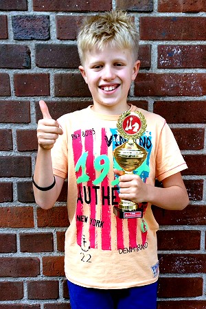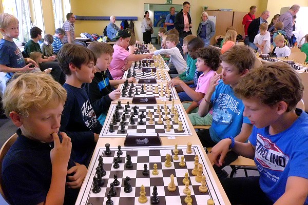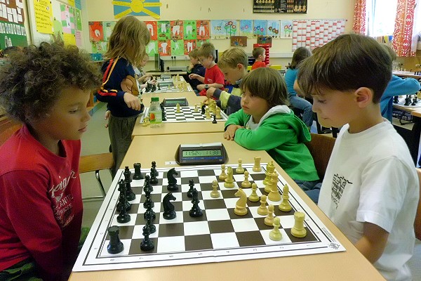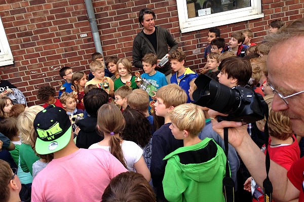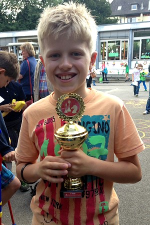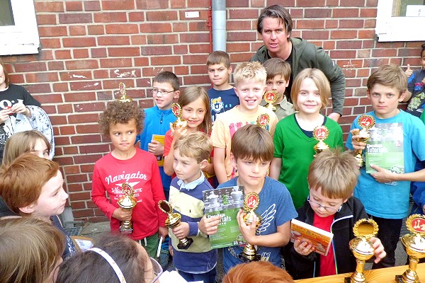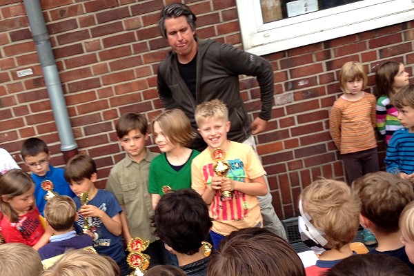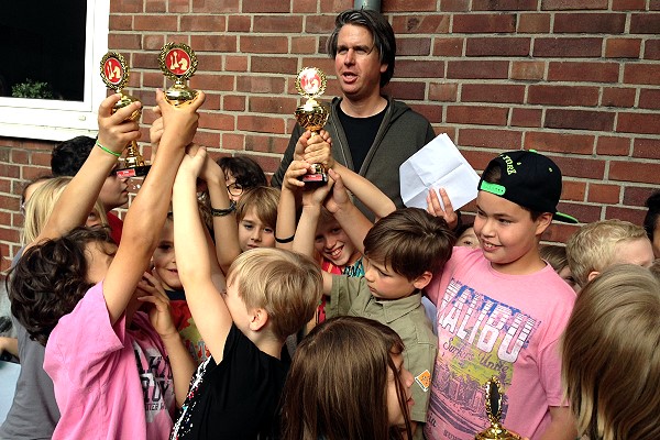 Nachschlag zum Sparkassen - Grundschulturnier: Frau Zamhöfer hat einige Fotos zur Verfügung gestellt, die wir hier gerne nachreichen. Hier freuen sich der Leiter der Schach-AG Stefan Krückhans (links) und sein Co-Trainer Lukas Schimnatkowski (rechts) mit ihren Schützlingen Luca, Noel, Dylan und Juan über den 1. Platz in der Mannschaftswertung. Weitere Schnappschüsse vom Turnier gibt's in der kleinen Bildergalerie: