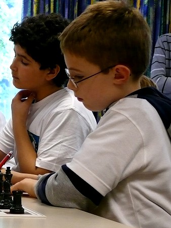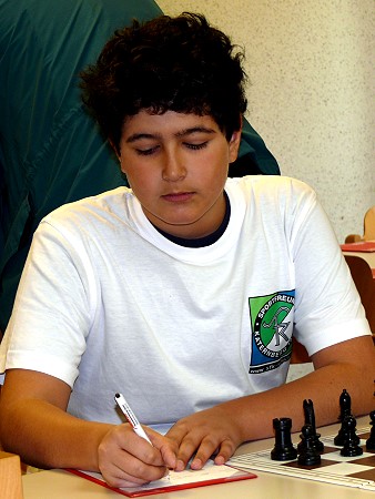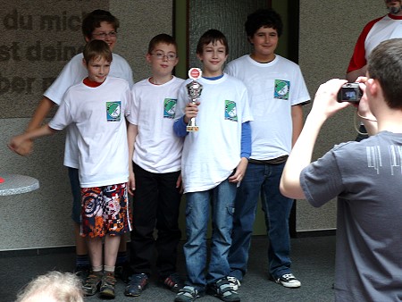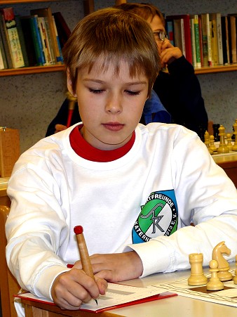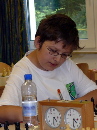 2. Runde: Die Mannschaft aus Raesfeld-Erle hatte vor dem Turnier keiner auf der Rechnung, aber die Truppe war wesentlich stärker als die Wertungszahlen vermuten ließen. Patrick kam zu einem leichten Sieg, aber Tim büßte einige Bauern ein und verlor ebenso wie Anna, die für ihren in der Eröffnung geopferten Bauern nicht genügend Spiel bekam. Held des Tages war Arman, der schnell einen Springer verlor, seine Kräfte aber gegen den weißen König konzentrierte. Nach einer wahren Opferorgie, in deren Verlauf ein Bauer, der zweite Springer und schließlich auch noch ein Turm ihr Leben lassen mussten, brachte er den König seines Gegners zur Strecke. Endstand: 2:2.
