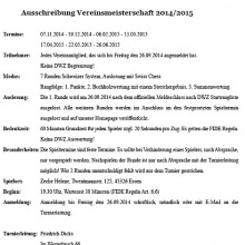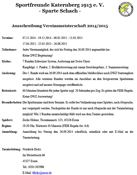 Auch die Vereinsmeisterschaft 2014/15 wird im bewährten Modus ausgetragen: 7 Runden Schweizer System, Bedenkzeit: 60 Minuten für die Partie plus 20 Sekunden je Zug. Termine: 07.11.2014 - 19.12.2014 - 06.02.2015 - 13.03.2015 - 17.04.2015 - 22.05.2015 - 26.06.2015. Meldeschluss: 26.09.2014 bei unserem Spielleiter Friedrich Dicks.
