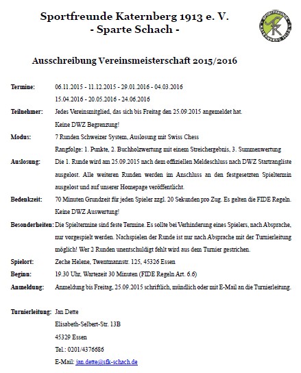 Die Vereinsmeisterschaft 2014/15 endet zwar erst (verspätet) am 21.08., aber die Auslosung für die kommende Saison ist schon raus. Sie wird im bewährten Modus mit einer kleinen Änderung ausgetragen: 7 Runden Schweizer System, Bedenkzeit: 70 Minuten für die Partie (neu - 10 Minuten mehr als bisher) plus 20 Sekunden je Zug. Termine: 06.11.2015 - 11.12.2015 - 29.01.2016 - 04.03.2016 - 15.04.2016 - 20.05.2016 - 24.06.2016. Meldeschluss: 25.09.2015 bei unserem Spielleiter Jan Dette.