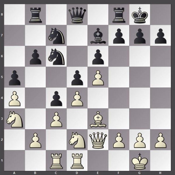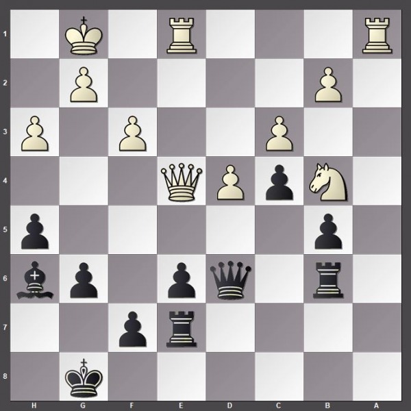 Am dritten Brett hatte Max Heldt in der Eröffnung bereits einige Schwierigkeiten. Nach 1.c4 e5 2.Sc3 Sf6 3.g3 c6?! spielte Max 4.Lg2?! (Hier ist 4.Sf3! besser und nach 4...e4 5.Sd4 d5 (Wenn 5...c5?, dann 6.Sc2 und Weiß steht nach Anhebeln des Zentrums gut) 6.cxd5 Db6 7.Sb3 und in Nakamura-Bacrot, 2012 hat sich gezeigt, dass Weiß nach 7...a5 8.d3! a4 9.Sd2 deutlich besser steht, weil das schwarze Zentrum zerfällt) 4...d5 5.cxd5? (Lieber mit 5.d4! die Spannung im Zentrum aufrechterhalten!) 6.d4 e4 7.f3 und nach 7...Lb4 8.Lg5 Sbd7 9.fxe4 dxe4 10.e3? (Nach 10.Sh3 kann Weiß noch um Ausgleich kämpfen) 10...Da5 entsteht diese Stellung: