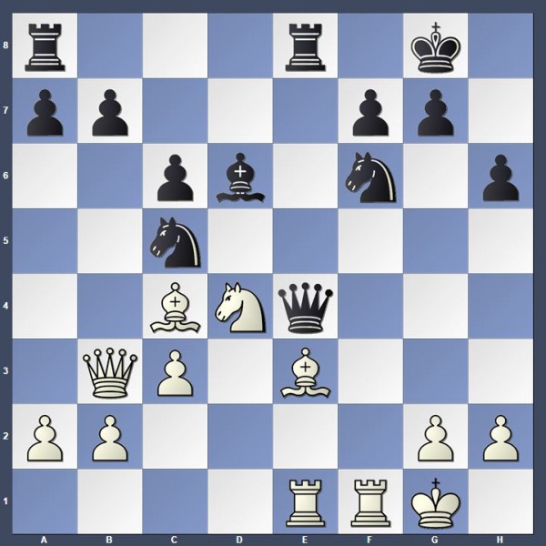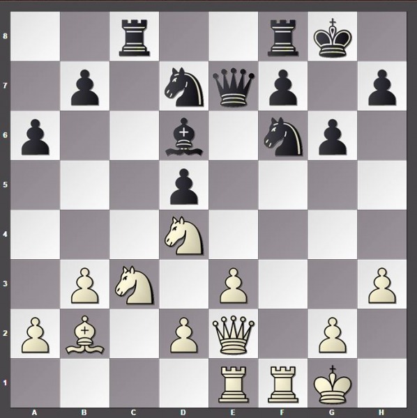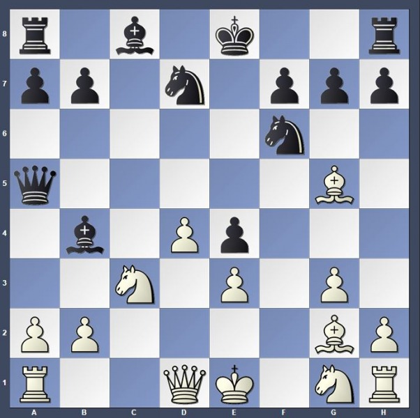 Ich selbst hatte am zweiten Brett nach der eindeutigen Niederlage gegen Vincent Keymer und der kritischen Anmerkungen einiger Kommentatoren dazu trotzdem erneut die Fantasie-Variante 1.e4 c6 2.d4 d5 3.f3 gespielt. Auch in dieser Partie wählte mein Gegner das ambitionierte 3...dxe4. Nach 4.fxe4 e5 5.Sf3 Lg4 6.Lc4 Sd7 7.c3 Ld6 8.0-0 Sgf6 hatte ich mir aber natürlich mit 9.Lg5 eine bessere Variante als 9.De1? zurechtgelegt. Es ging weiter mit 9...h6 10.Le3 0-0 11.Sbd2 De7?!, was mich stutzig werden ließ, weil ich mir nicht vorstellen konnte, dass die e-Linie der richtige Platz für die schwarze Dame ist. Nach weiterer Recherche zeigt sich, dass an dieser Stelle 11...Lh5! wohl angebracht ist, um Sg4 zu drohen und mit Lg6 den Druck gegen e4 zu erhöhen. Stattdessen gelang es meinem Gegner nicht, gefährlichen Druck gegen e4 aufzubauen. Einige Züge später entschied ich mich bereits, diesen Bauern zu opfern, um taktische Schläge gegen den schwarzen König und die sich immer noch in der e-Linie befindliche schwarze Dame vorzubereiten. Es entstand diese Stellung: