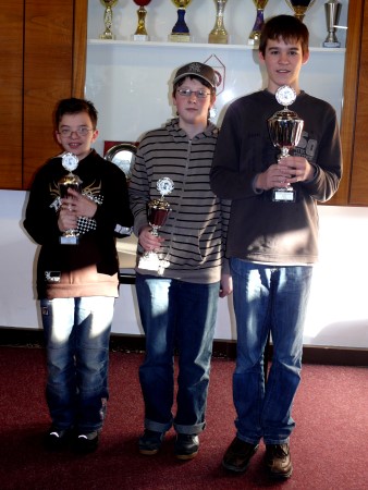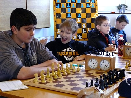 Vor der letzten Runde saßen Arman, Anna und Lukas (v.l.n.r.) einträchtig nebeneinander an den Brettern 5, 6 und 7. Leider musste Arman nach zu halbherzigem Spiel eine Niederlage gegen den starken Tim Birnkraut hinnehmen - er kam wie Lukas auf fünf Punkte, darf sich aber ebenfalls über einen DWZ-Zuwachs von ca. 130 Punkten freuen. Anna startete schwach, kam aber immer besser in Fahrt und katapultierte sich durch einen energischen Endspurt mit drei Siegen (darunter ein 7zügiges Matt) noch auf den 8. Platz. Damit war sie bestes Mädchen und hatte auch die meisten Punkte von allen teilnehmenden U10-Spielern errungen - auch ihre DWZ wird um runde 90 Punkte steigen.