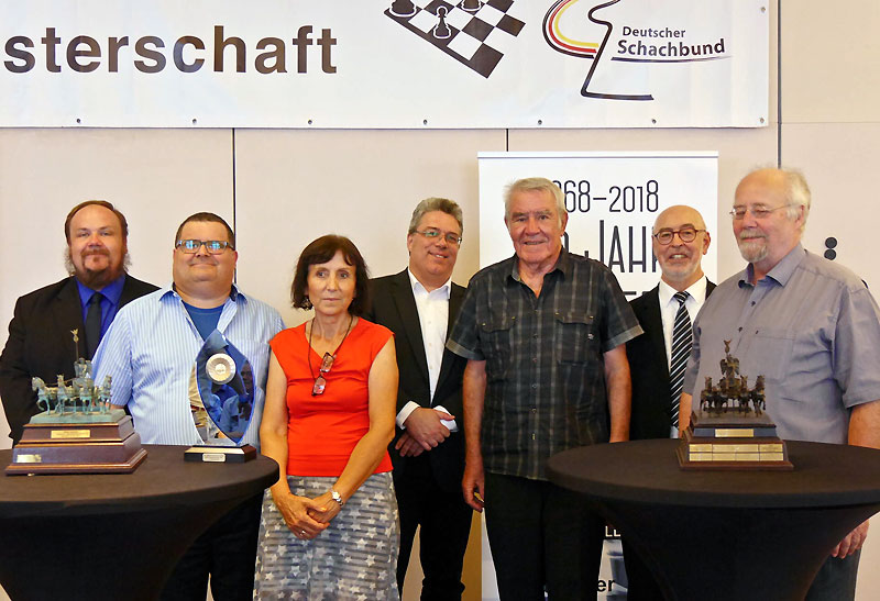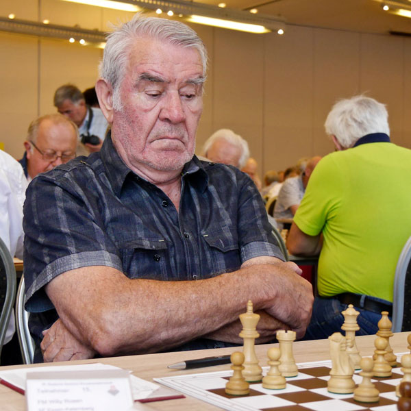 Dass Willy Rosen nicht nur ein Viel-, sondern auch ein echter Topspieler ist, zeigte sich bei der anschließenden Siegerehrung: Hier durfte er nämlich noch einmal auf die Bühne, um die Auszeichnung als Deutscher Nestorenmeister 2018 entgegen zu nehmen: Mit 6,5 Punkten aus 9 Runden hatte er im Turnier 65+ das beste Ergebnis aller Teilnehmer über 75 Jahre erzielt. Nach 1953 (Deutscher Jugendmeister), 1993 (Deutscher Seniorenmeister) und 2010 (Deutscher Nestorenmeister) ist dies bereits sein vierter nationaler Meistertitel. Bedenkt man, dass diese Titel sich über einen Zeitraum von 65 Jahren erstrecken, wird eine sportliche Langlebigkeit erkennbar, die ihresgleichen sucht. Wir gratulieren Willy Rosen - nebenbei unser noch amtierender Vereinsmeister! - sehr herzlich zu dem herausragenden Erfolg und wünschen ihm noch viele erquickliche Stunden am Schachbrett!